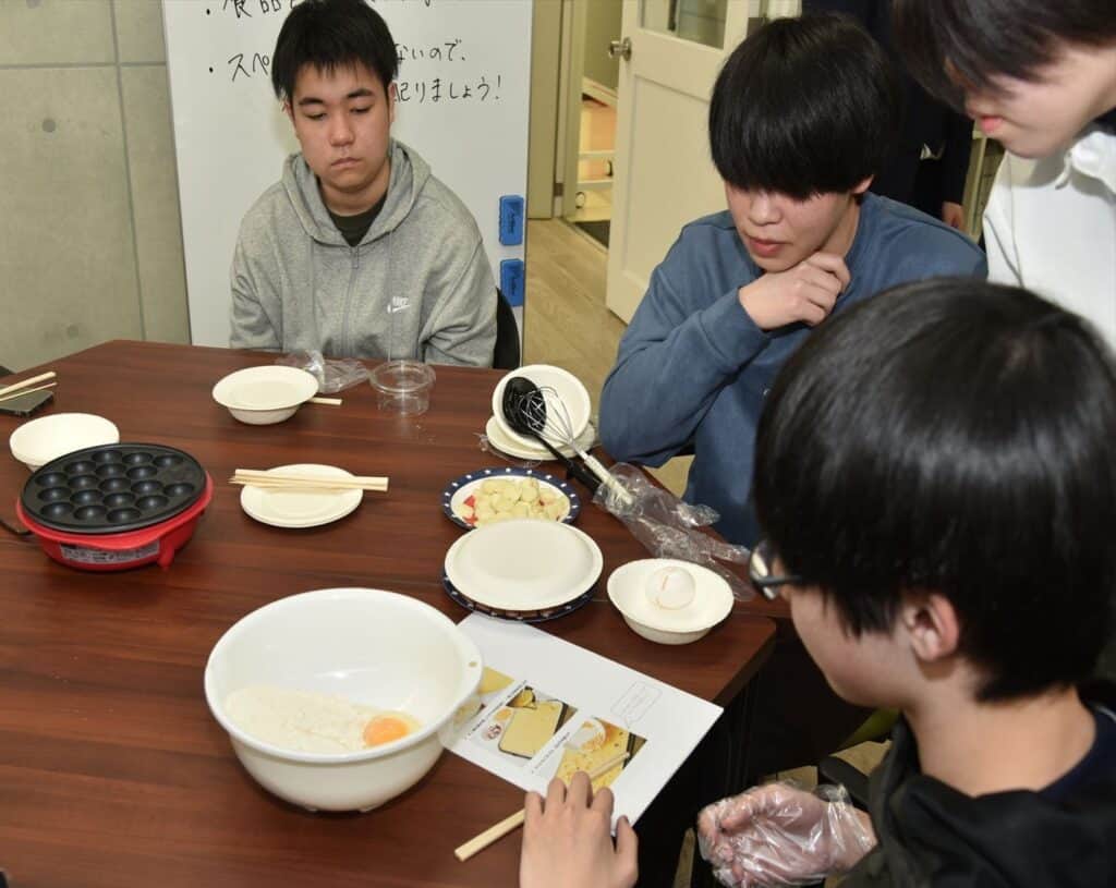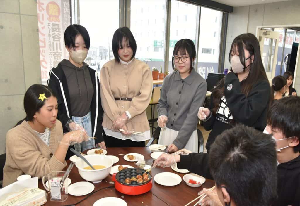 レクリエーションをはさみつつ、グループでたこ焼きを作り、親交を深める様子が見られました。