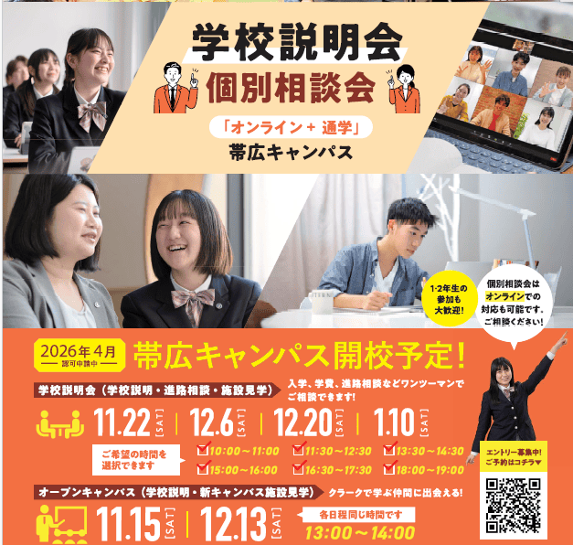 クラーク記念国際高等学校・帯広キャンパスの学校説明・個別相談会では、通信制高校入学後、卒業するまでの流れについてのご案内のほか、学校紹介・コース説明や学費、入試制度のご案内を行います。進路活動に関するご相談や、アドバイス等も行っており、入試シーズンへ向けて皆さまにご安心いただける内容となっています。