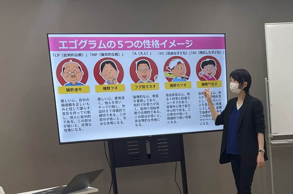 初めに自己分析のツールである「エゴグラム」を通して、自分の現在の状態を確認しました。50の質問からなるこの分析は「良し・悪し」を判断するのではなく、自分の行動や感情など性格的な傾向を理解するためにあります。