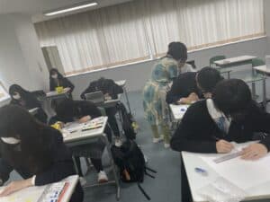 国際コースでは、英語のクラスは学年別ではなく、レベル別に分かれています。そのため、1、2年生は先輩と一緒に授業を受ける機会が多いです。3年生は、英語の効果的な勉強法や大学の探し方など、後輩にたくさんのアドバイスをしてくれました。