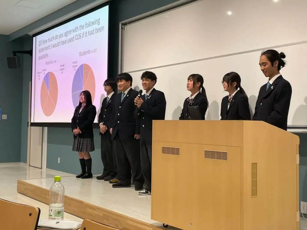 クラークのチーム「Ambitious」は2年連続で決勝に進出。今年は新制服リユースプログラムに関するプレゼンテーションを行い、結果は全道大会で5位に入賞。チーム「Ambitious」のメンバーは、制服リユースプログラムによって高校生の家族が8万円以上節約でき、次世代のための環境保護に役立つことを英語で説明しました。