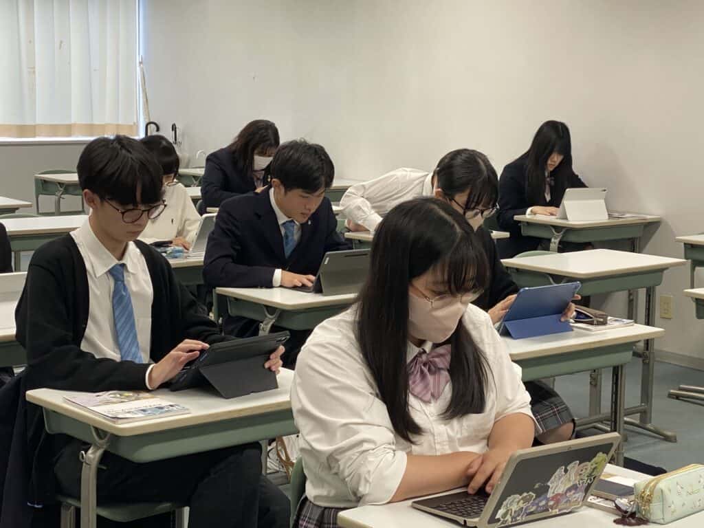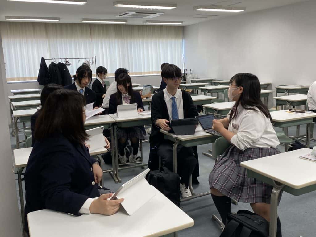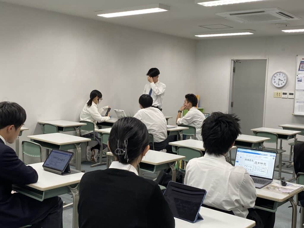 本日の総合進学コース2年生の「ビジネス・コミュニュケーション」授業では、自民党総裁選の公約を読み、どのような人にビジネスパートナーになってもらいたいのかを個人ワーク、グループワークを行い考えました。