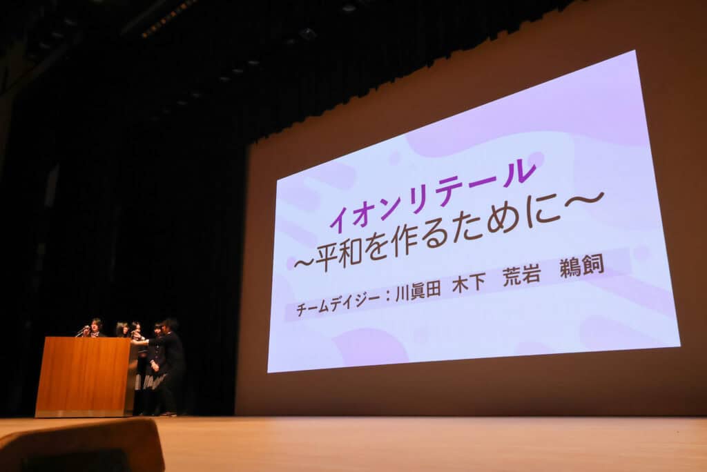 成果発表会では、代表の1チームが発表を行いました。チーム名「デイジー」は、イオンリテールの課題「平和が始まるイオンが本気で取り組むべきチャレンジを提案せよ」に高校生の目線で答えを導き出しました。その答えは「みんなの心の安寧が保たれる平和を目指したい」です。その為に自分の気持ちを紙に書き出してみるというジャーナリングを活用した「キモチ・カプセル」を提案しました。これはイオン店舗内の各フロアに付箋ほどの大きさの大きさの色画用紙とボールペン、書いたものを入れるボックスを設置します。それらを使用して、来店されたお客様に「最近頑張ったことや楽しかったことなどのテーマに沿って自分の気持ちを書いてもららい、それを共有するというものです。これにより、多くの人が気持ちをシェアすることで気持ちが落ち着いて平和に導くことができるというものです。