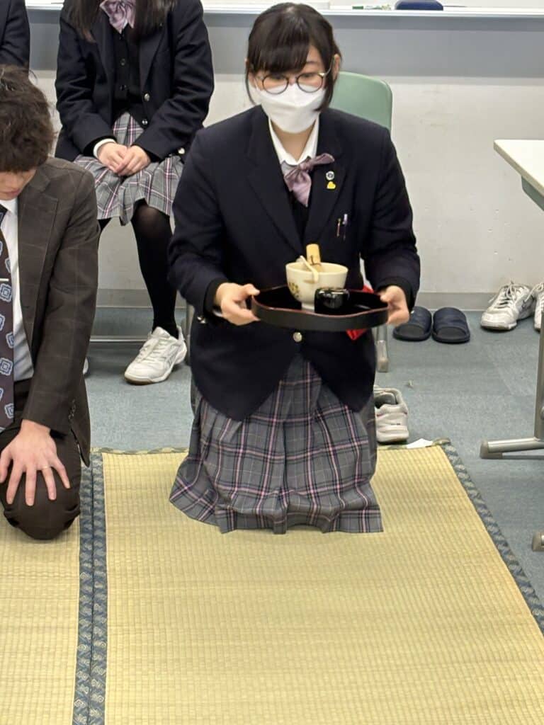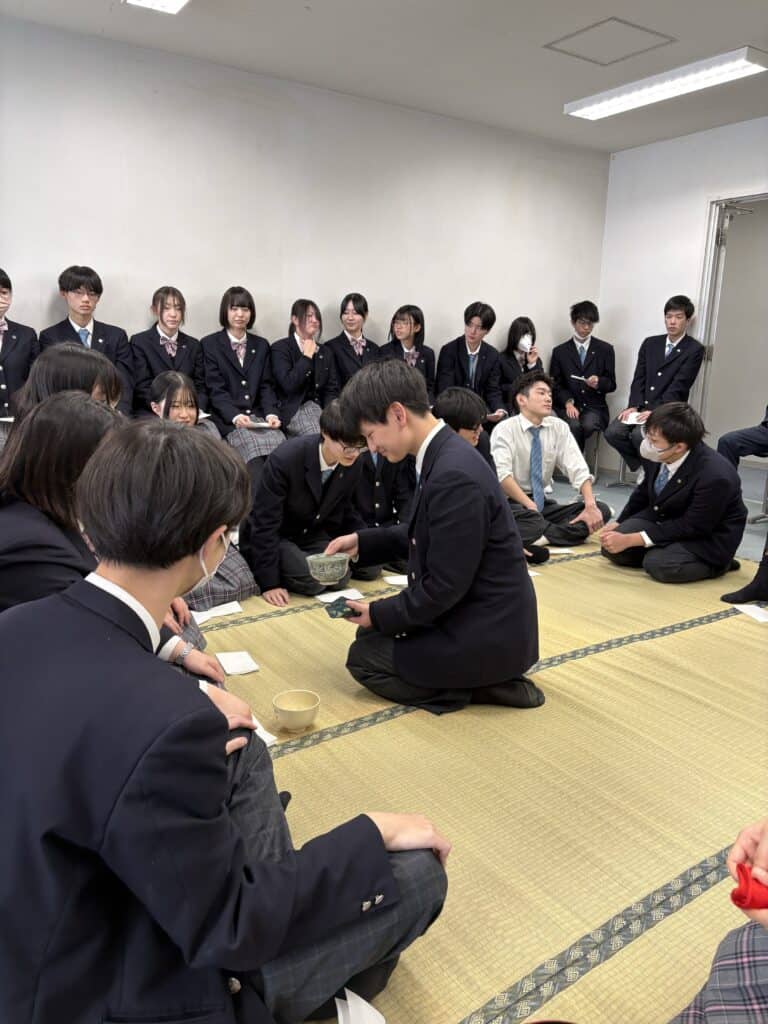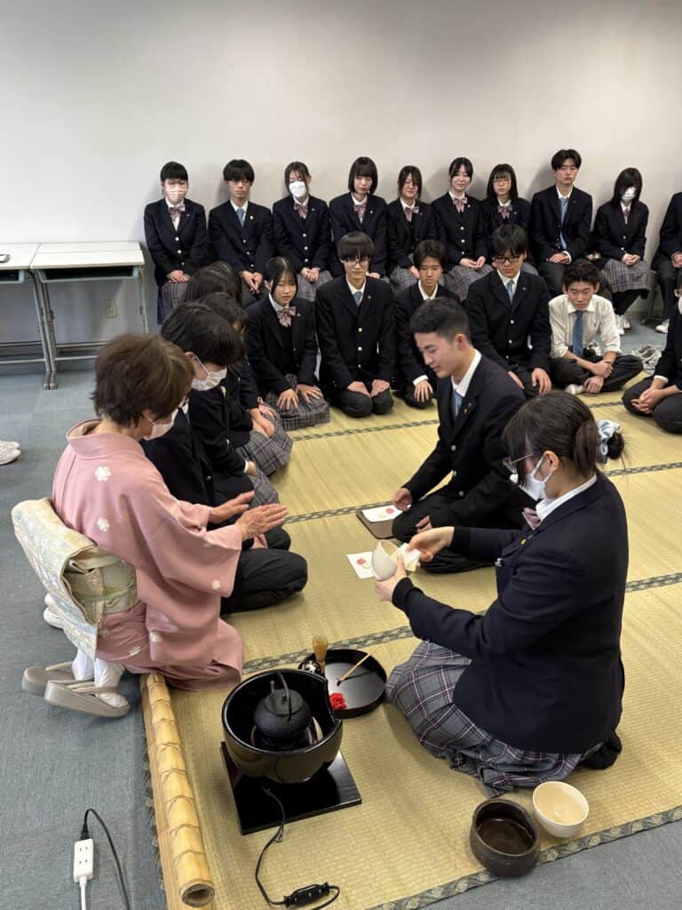 今回は、「表現教育」授業で茶道の学習した生徒たちが、茶道を知らない1.2年生をおもてなし。授業内で学んできた裏千家の作法や文化を披露してくれました。