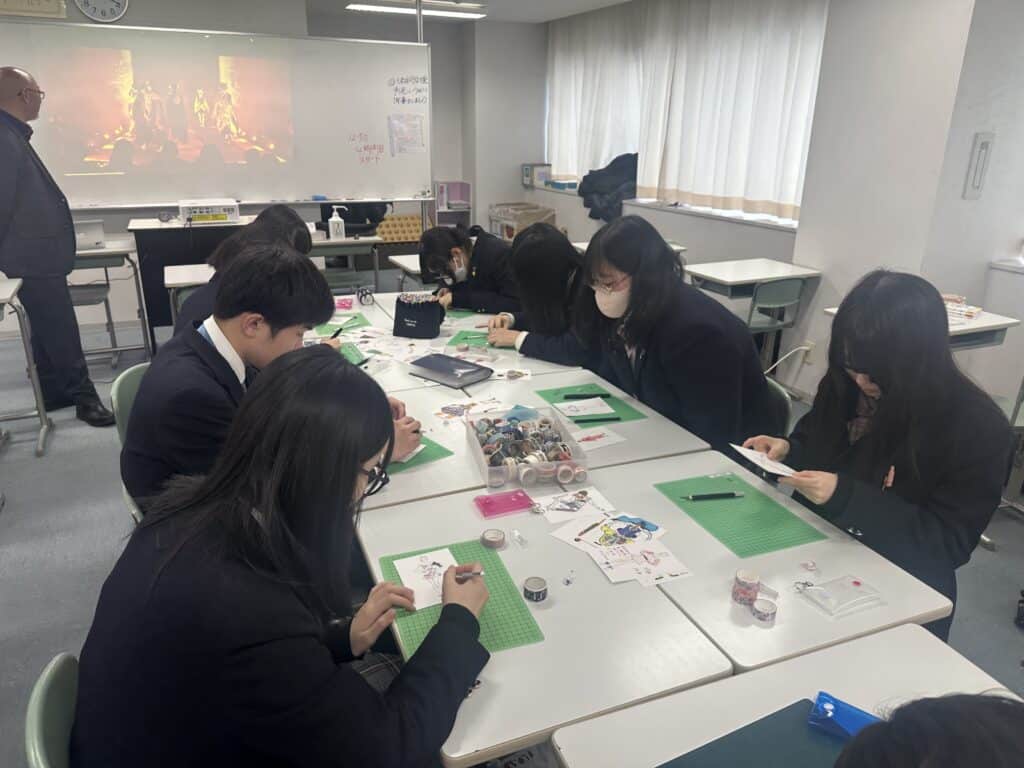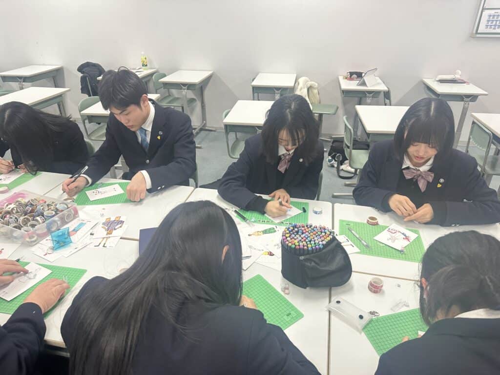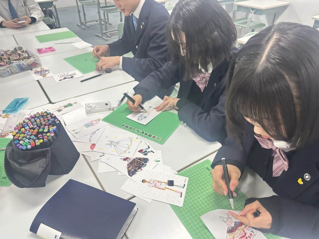 今回は北海道ファッション専門学校の方が来校され、ファッション業界のトレンドについて話をしたいただきました。その後、体験授業として、様々なマスキングテープとサインペンを活用して新しい服装のデザインを体験しました。体験した生徒は、楽しみながら新たなファッションデザインを捜索していきました。