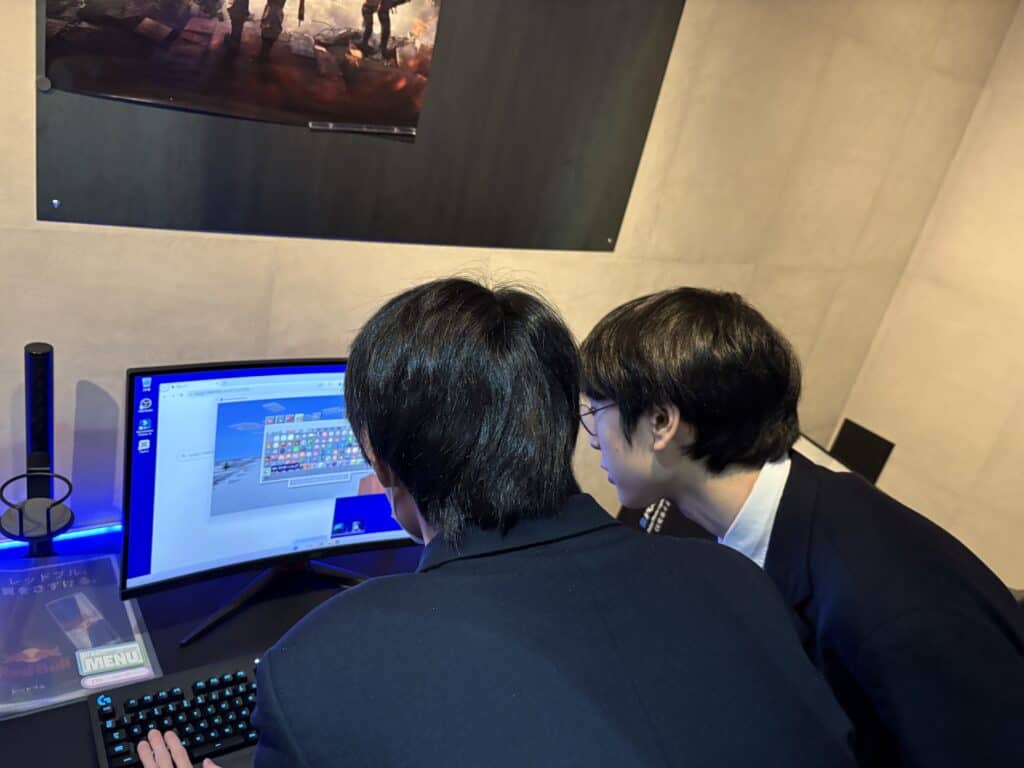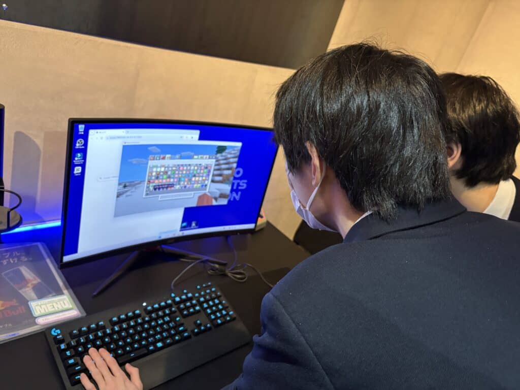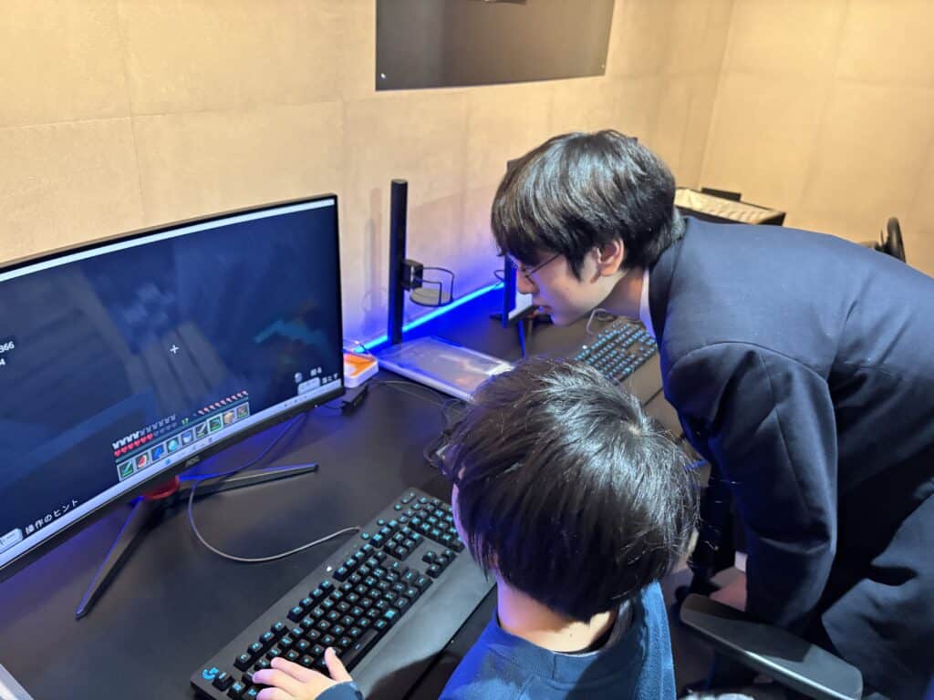 今回は、苗穂駅前にあるNAEBO ESPORTS STATIONで行われている小学生向けeスポーツ教室でボランティア。日々の学びでeスポーツを学んでいる生徒が、自分達が普段声掛けされている事を意識しながらMinecraftを教えていきました。