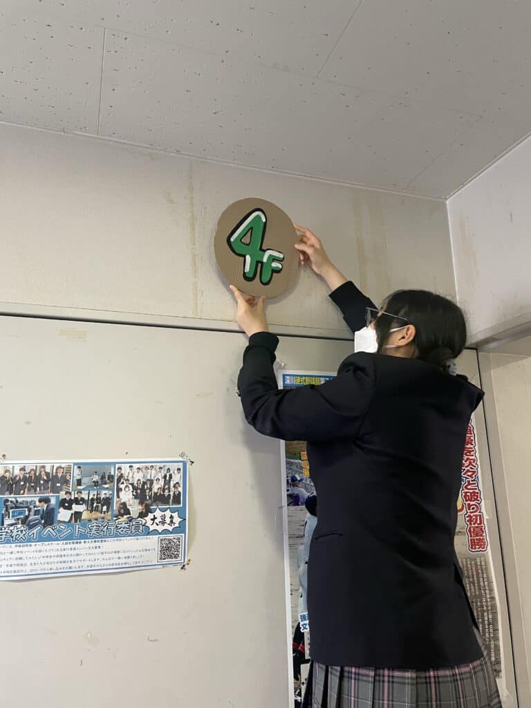 来校された方に、階数を分かりやすく伝えたい、在校生にとってもより良い学校生活を送ってほしい…との生徒の願いから掲示物を作成しました。