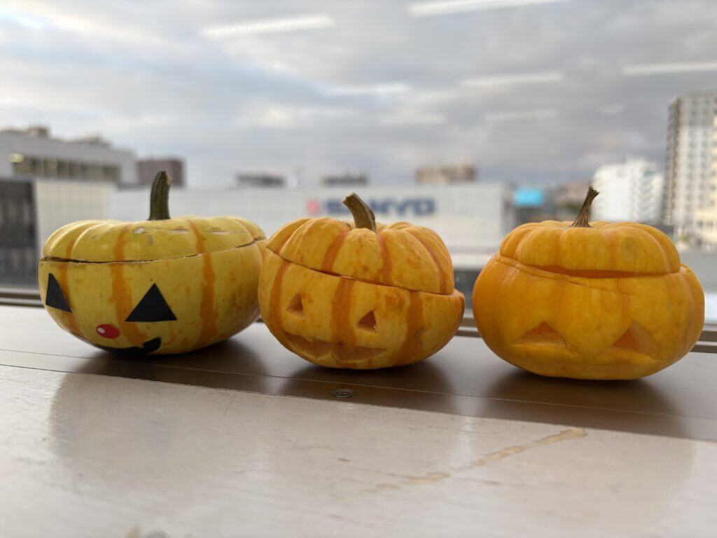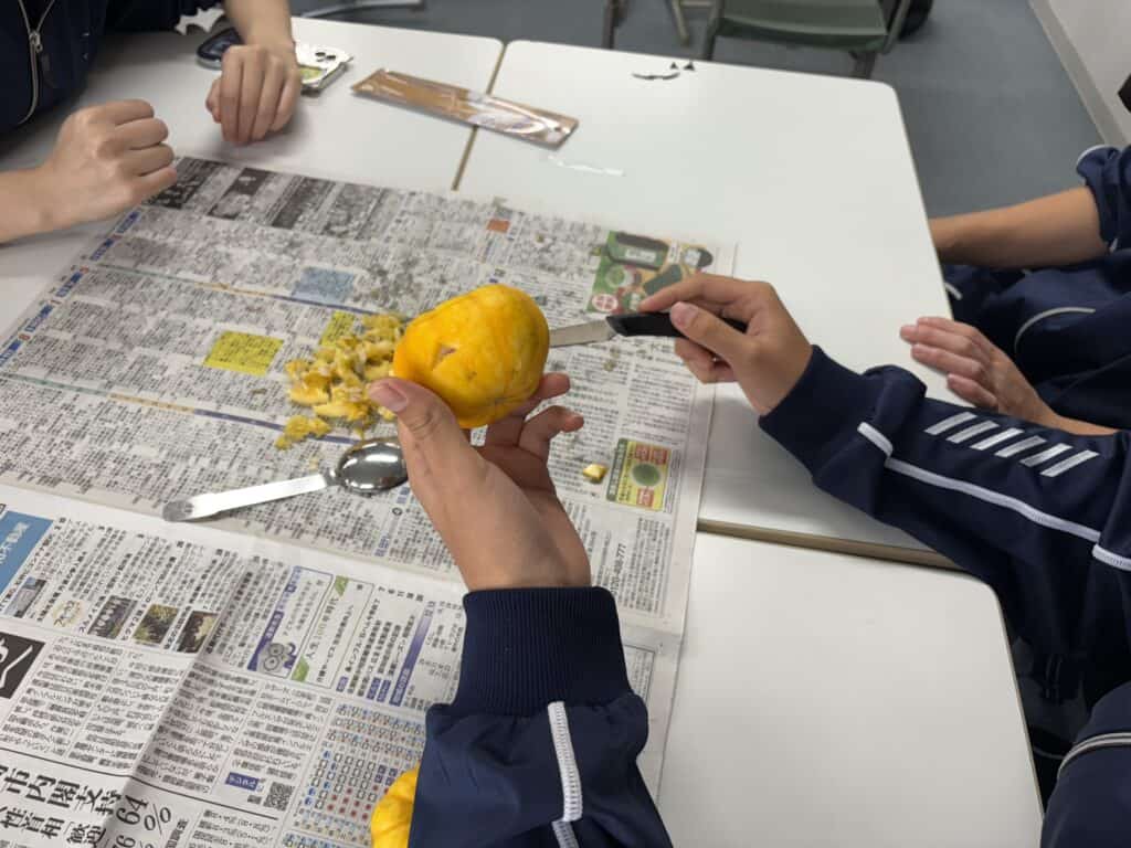 今回はハロウィンに合わせ、ジャックオランタンを作りました。思ったようにかぼちゃが切れず苦戦したり、意外な仲間が器用に口をかたどったりなど、普段学習しているだけでは生まれない交流ができました。