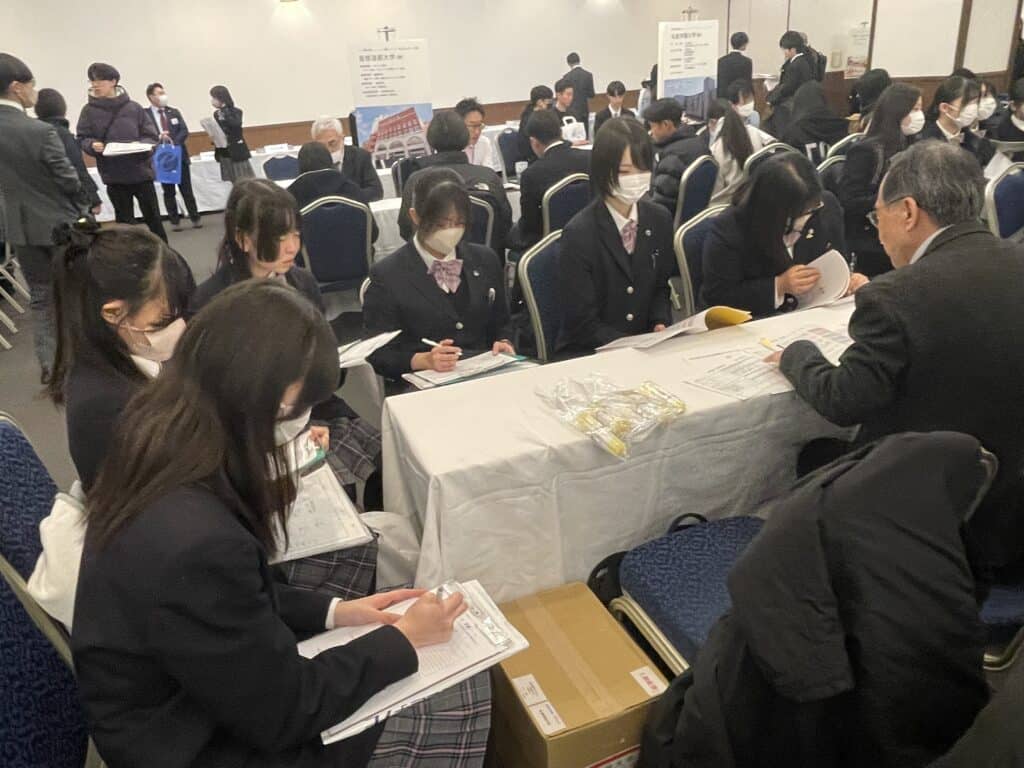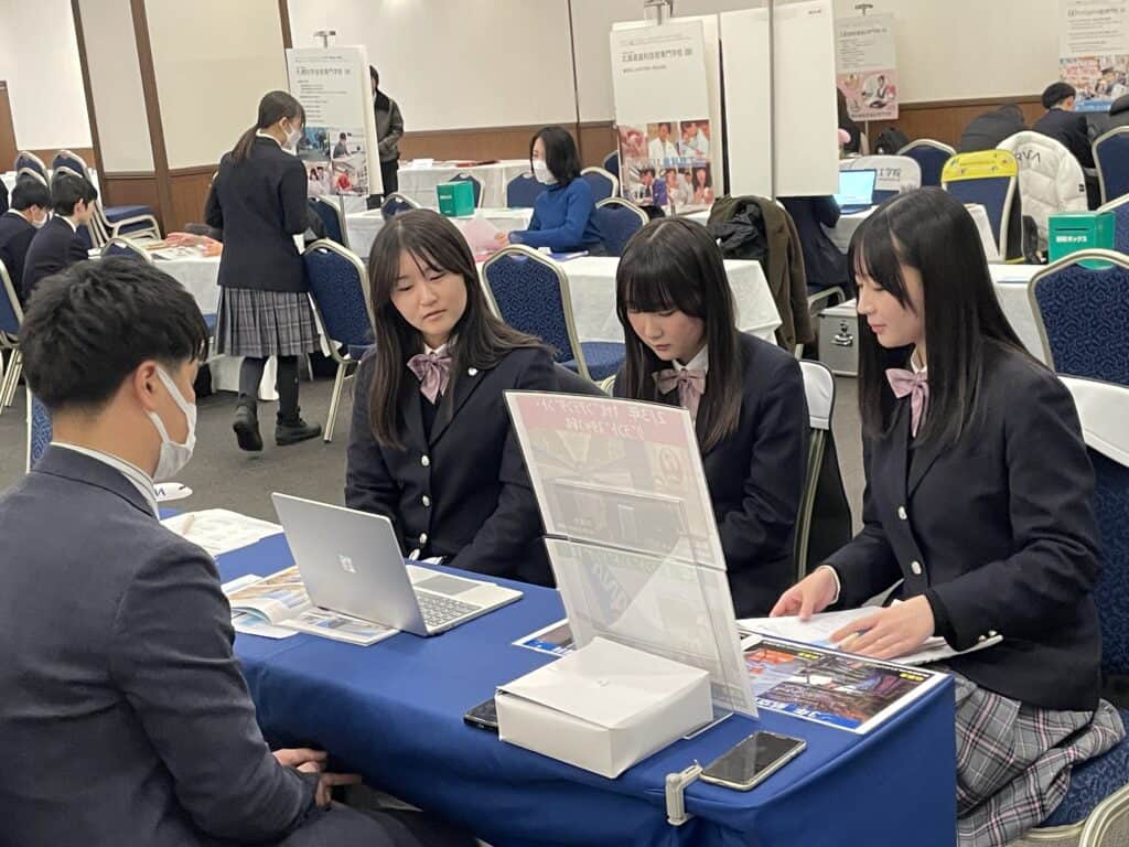 50校を超える大学・短期大学・専門学校の方に説明や相談をしていただき、生徒たちの進路意識が高まりました。生徒たちからは、「なかなか自分で足を運ぶことはないから、授業でこういうイベントに行けるのはありがたい」、「もともと興味のあった学校の志望度がさらに高まった」などの声が。前向きに進路に対して考えることのできた一日でした。