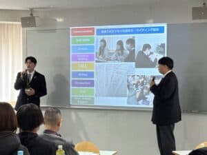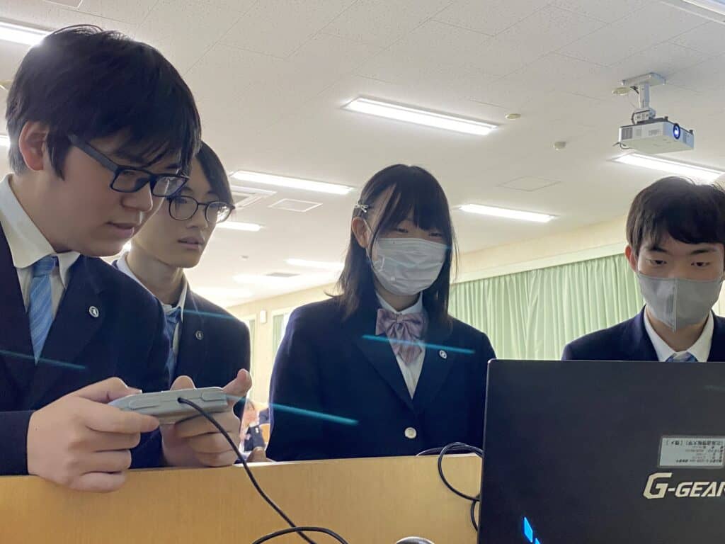 今回は、校舎の施設の見学に加え、「ゲームクリエイター体験」というゲームを通じた地域活性化について講義を行っていただきました。ゲーム作成には企画の立案などに関わるプランナー・プロデューサー・ディレクターや、キャラクター・背景などに関わる2D・3Dデザイナー・サウンドクリエイター、ゲームとしての動きを担うプログラマー、その他にもシナリオライターや広報・営業など様々な専門家が関わっているということを学びました。最後には、学生が製作したオリジナルゲームを体験させていただき、盛り上がりを見せながらも、普段何気なくやっているゲームが作られる裏側を知った生徒たちは、「これを企業じゃなくて個人で作れるのはすごい」 「自分もこんなゲーム作ってみたい」など、楽しむだけではなく何か感じ取ることができたようです。