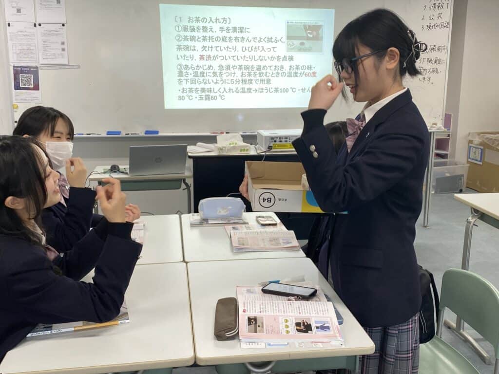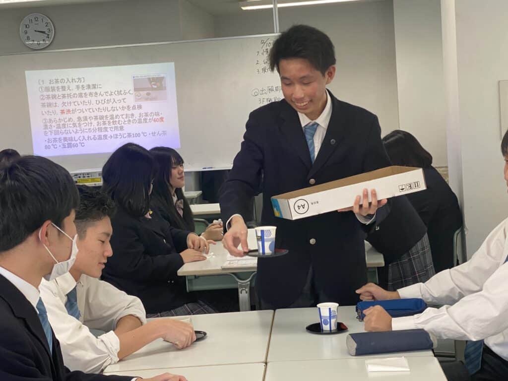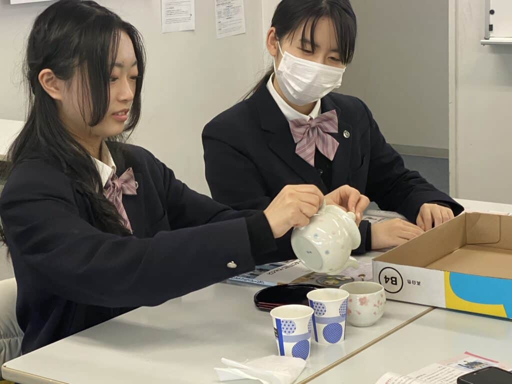 お茶をいれるまでに、湯呑みや茶托を拭いて準備、お湯の温度、戻りつぎ。お客様にお茶をお出しするまでの流れをグループで協力をしながら学びました。
