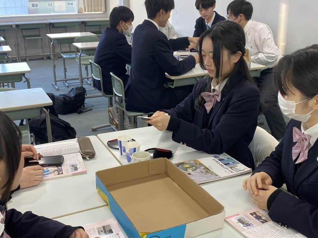 2年生、総合進学コースの「ビジネス・コミュニケーション」授業では、社会に出た際にすぐに役立つ知識を身につける学習を、教科書だけではなく、ロールプレイングを通して学んでいます。