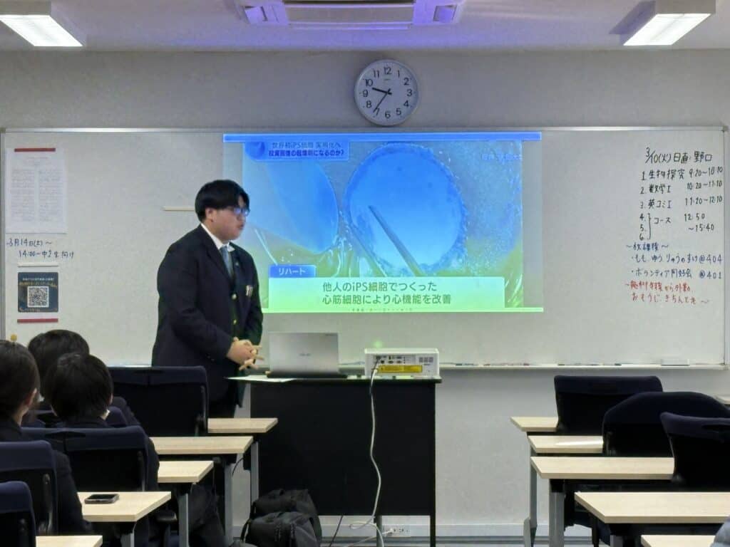 「理科(生物基礎)」の時間では、生徒一人一人が自分の興味のあることについて探究する時間を設けています。今回は再生医療について探究していた生徒が、他の生徒に向けて再生医療について知ってもらうための講義を実施しました。講義では、再生医療についての概要や最新の研究の紹介だけにとどまらず、これまでの医療との違いやリスクについても話してくれました。特に、メディアの報道の仕方により過剰な期待がかかることによって起こりうるリスクなど、なかなか普段は考えないような内容にまで触れている点は驚きでした。