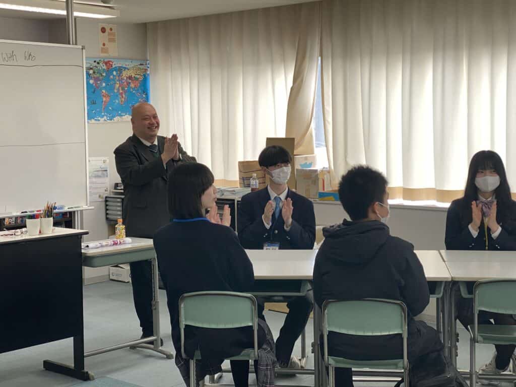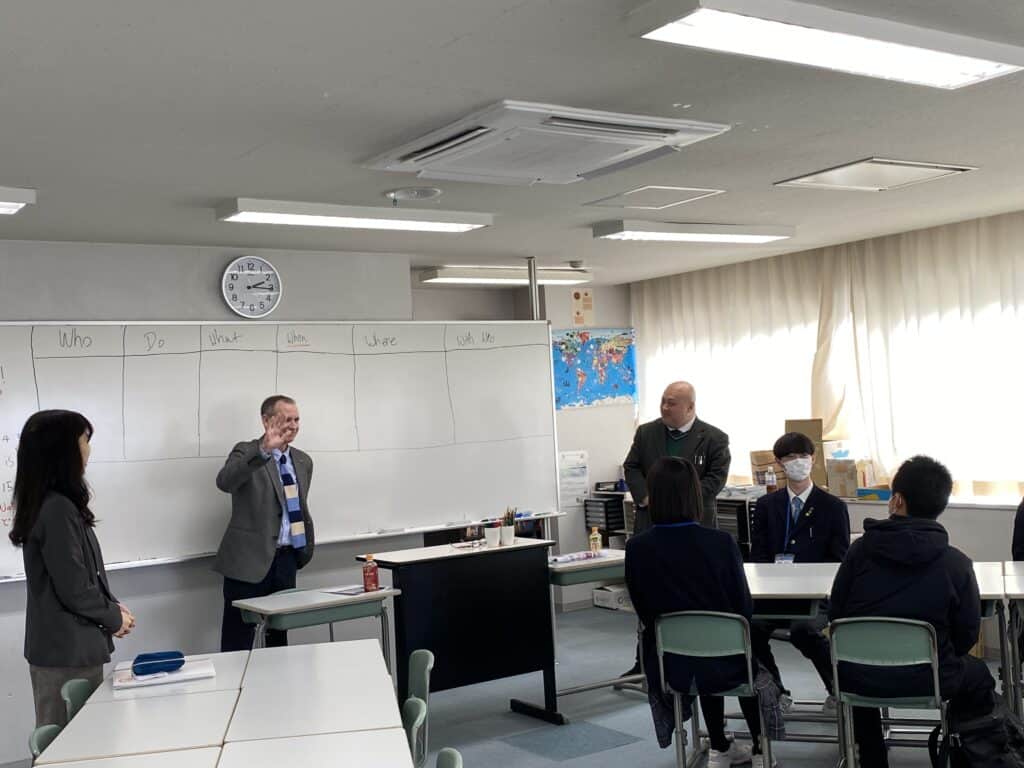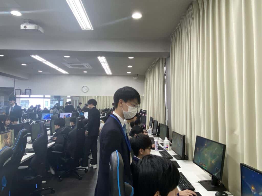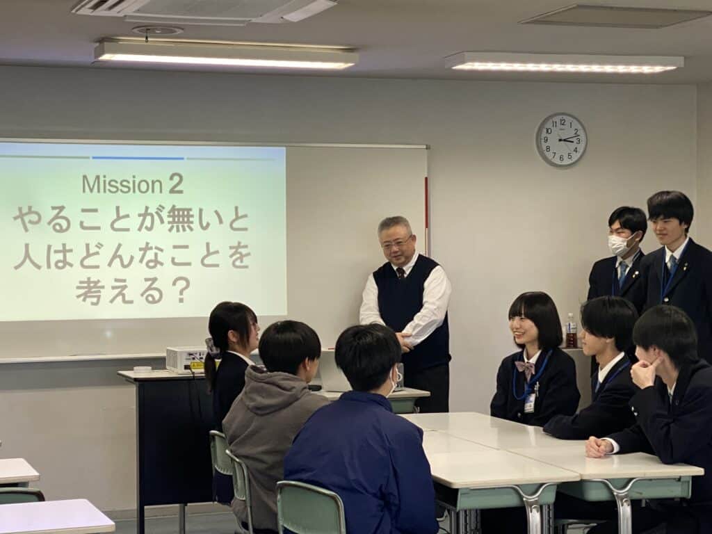 中野校長による朝のホームルームからスタート!ホールルームが始まる前から在校生は中学生の皆さんと会話をしていますね。総合進学コース、国際コース、eスポーツの2時間の体験授業を選択肢、中野校長のいってらっしゃい、でそれぞれの体験授業教室へ移動。