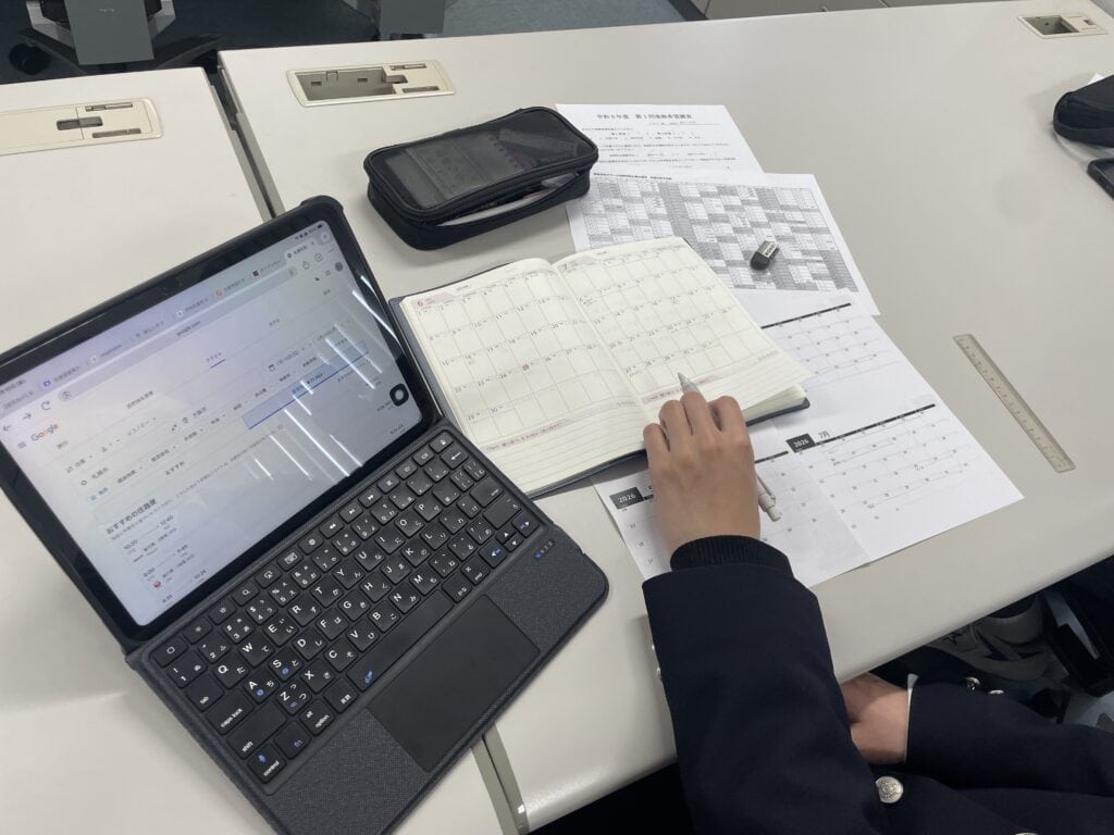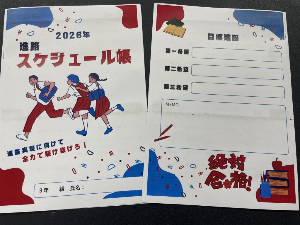 入試までのスケジュール管理を意識付けるために「進路スケジュール帳」を作成しました。スケジュール帳はこの1年間のカレンダーが閉じられており、裏表紙には自身の志望校を書き込める仕様になっています。3学年の先生たちの手作りです。