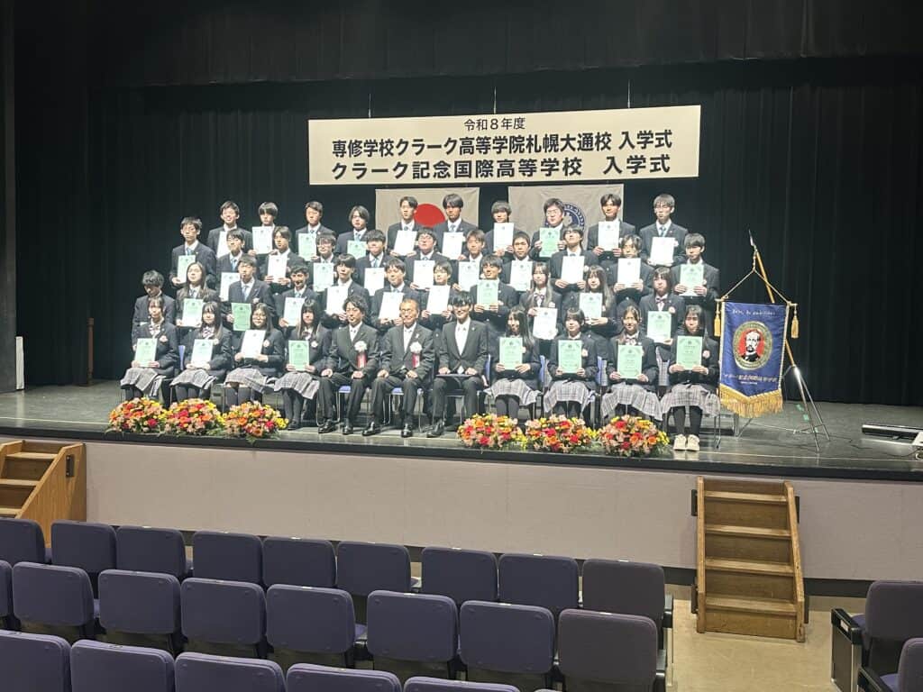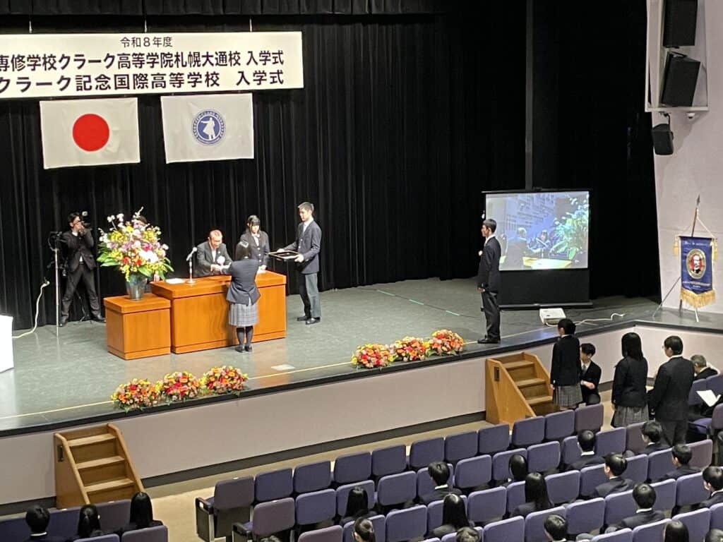 2026年4月11日(土) 専修学校クラーク高等学院札幌大通校、および連携校、クラーク記念国際高等学校の入学式が挙行されました。入学式では全新入生が壇上で校長先生より2校の入学許可書を受け取りました。