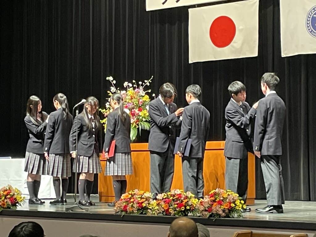 許可書授与の後は、新入生代表の言葉、在校生代表の言葉。そして、それぞれのコースの在校生、新入生代表者が「私の大志」として今後の抱負を発表しました。その後「スピリッツ伝承」で先輩が後輩に校章をつけました。