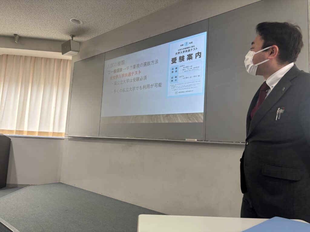 まず、「推薦入試」については、指定校推薦の仕組みや基準、出願から合格までの流れについて説明がありました。日々の成績や出席状況、学校生活への取り組みが大きく関わることが強調され、生徒たちは日頃の積み重ねの重要性を改めて実感する様子が見られました。