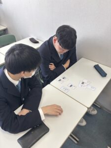 一日目の事前登校では、英語・数学の基礎学力チェックを実施。これは基礎学力の健康診断のようなもので、自分の苦手な単元をはっきりさせることができます。見つかった自分の苦手にどうやって学習計画をたてるか、在校生がメンターとなってアドバイスをしました。在校生たちも、新入生の雰囲気を和ませながら、また学校生活のことなど会話を交えながら、リラックスした状態で、作業を進めさせる工夫をしていました。
