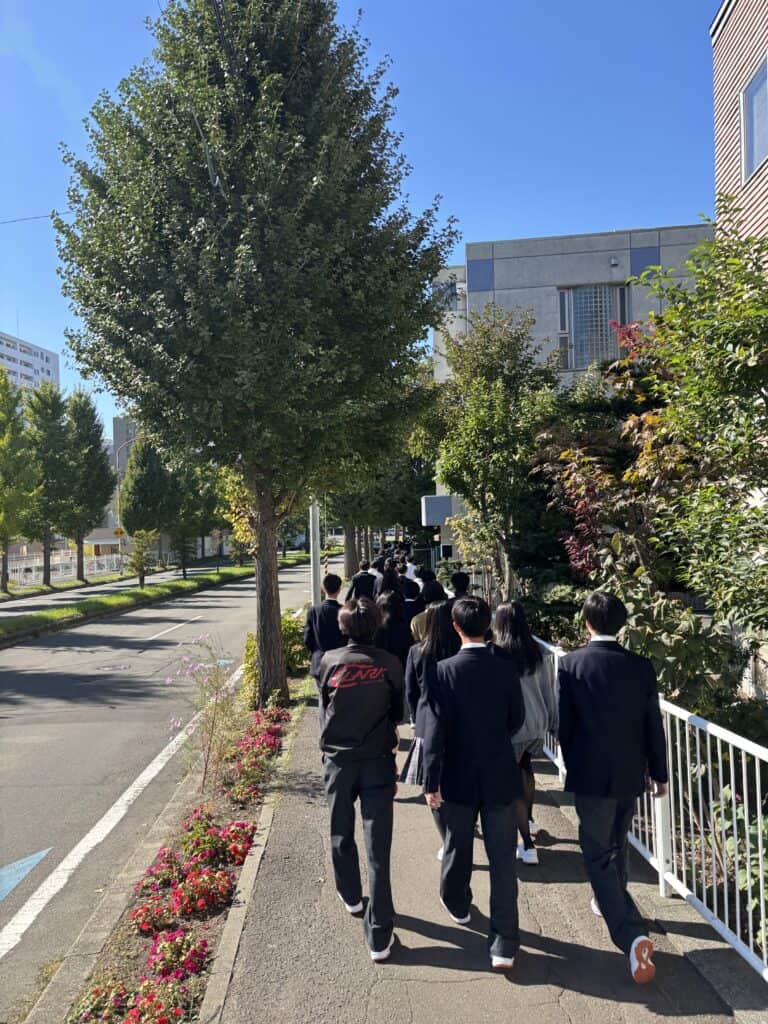 避難先である札幌市立中央小学校の校庭に到着後は、整列・点呼を行い、全員の安全を確認しました。その後、水消火器を使った初期消火訓練も実施。実際に消火器を手に取り、火元を想定して消火動作を体験することで、緊急時の対応をより具体的にイメージする機会となりました。