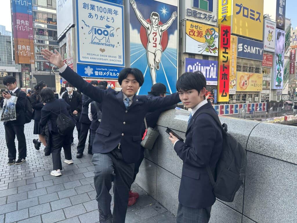 先ずは道頓堀周辺を散策しました。定番のグリコの看板前での撮影や大阪名物たこ焼きを堪能したり、各々大阪観光を満喫していました。その後、なんばグランド花月へ移動し、漫才の観劇を行いました。観劇中の写真撮影はできませんでしたが、生徒は大いに笑って関西のお笑い文化を堪能していました。
