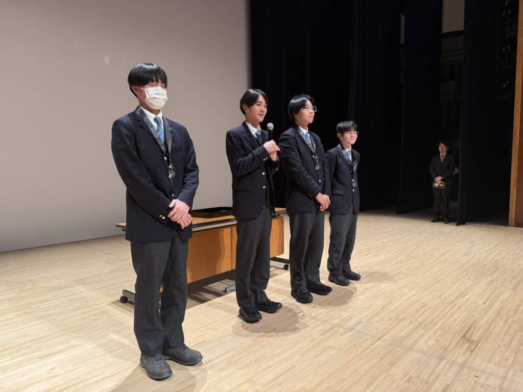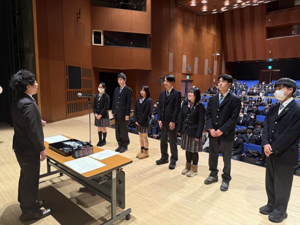 はじめに行われたのは、学力コンクールの表彰です。今回の表彰は、単に高得点を取った生徒だけでなく、「日々の積み重ねによって成績が大きく伸びた生徒」が対象となりました。毎日の授業や課題に真剣に向き合い、コツコツと努力を続けてきた成果が実を結び、大きな拍手が送られました。努力は必ず自分の力になるということを、改めて実感できる場面となりました。