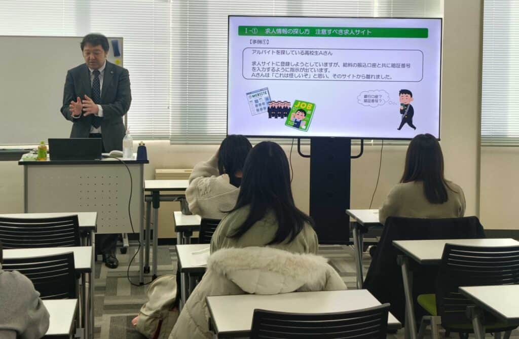 1月14日(水)苫小牧キャンパスの3年生を対象に、高校生を対象とした「労働条件セミナー」を実施しました。弁護士の先生にお越し頂き、働く上での基礎知識について学びました。在学中にアルバイトとして働く際や、近い将来社会人として働き始める際に安心して働けるよう、労働関係法令の基礎的な知識を習得し、「労働条件通知書」「割増賃金」「最低賃金」「有給休暇」など様々な専門用語について教えていただきました。労働についての条件や法律について、知らないまま我慢して働くのではなく、困ったときや疑問に感じた時に相談することの大切さを学び、社会人として役立ててもらいたいと思います