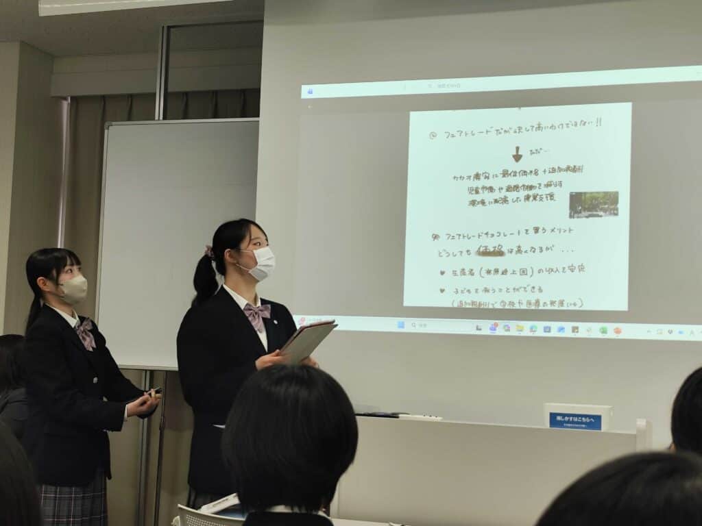 国際総合学科2年生の英語探究授業では、教科書を題材に「フェアトレードチョコレート」について学びました。