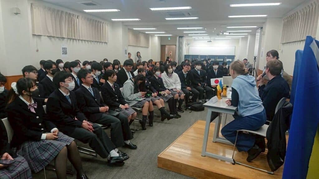 入場前は、多くの生徒が集まっている様子に緊張されていたそうですが、会が始まると生徒たちの積極的に質問してくれる姿勢や、温かな雰囲気に安心され、ウクライナの文化や日本との違いについてたくさん語ってくださいました。