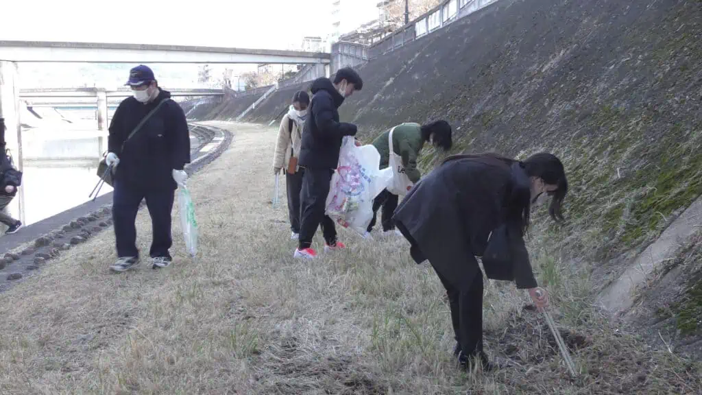 三田駅周辺の武庫川河川敷や商店街から三輪神社周辺まで、約1時間30分かけてゴミ拾いを行いました。