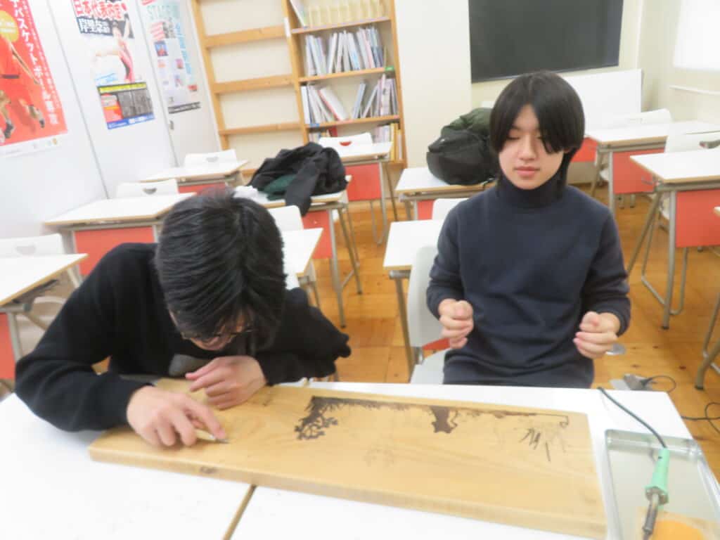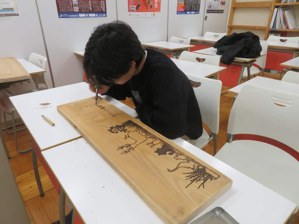 10月から始めた里山の看板製作が完成に近づいてきました。今回ははんだごてを使って動物のイラストや学校名を焼いていきました。とても細かい作業で時間もかかりますが根気よく作業しました。ようやく形が見えてきて、あとは彫刻刀で彫った部分に塗料を入れれば完成です。里山に看板を立てられる日ももうすぐ。楽しみです。