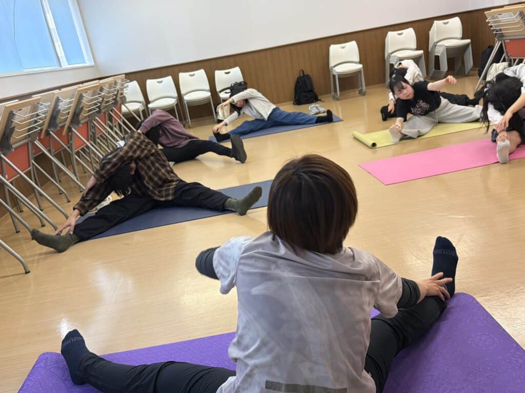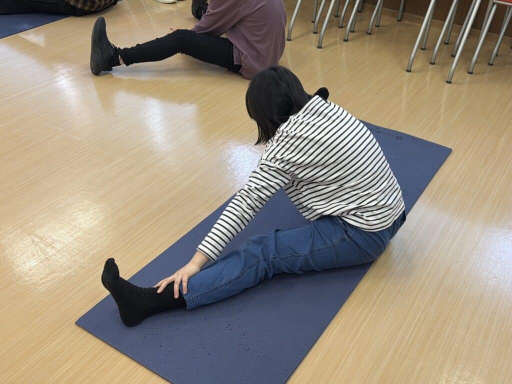 初回の授業では担当トレーナーの指導のもと、ストレッチを中心に体を動かしました。