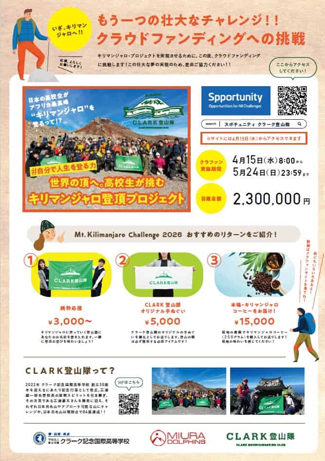 クラークの登山隊のメンバーが今年キリマンジャロ登頂をめざすということで、クラウドファウンディングがはじまりました。中東問題などで旅費が当初の予定よりあがったようです。せっかくの高校生のチャレンジですので、応援していきたいです!