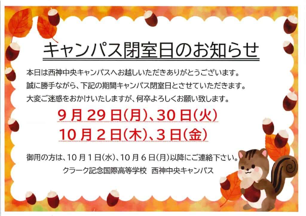 西神中央キャンパスは、9月29日(月)、30日(火)、10月2日(木)、3日(金)(体育祭のため)の期間お休みなります。御用の方は10月1日(水)、10月6日(月)以降にご連絡ください。季節の変わり目ですので、体調を崩されませんようご留意ください。