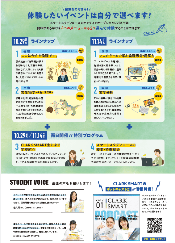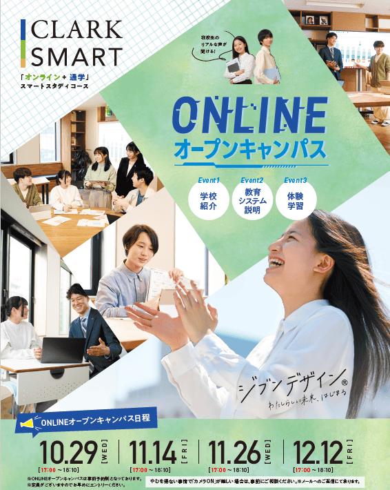【西神中央(全国共通)】2026年度ONLINE オープンキャンパス開催決定! 2025 10/04 オープンキャンパス お知らせ 募集中 2025年4月21日 2025年度ONLINEオープンキャンパスの日程になります。授業の体験や在校生の話を聞くことができるイベントを予定しています。是非ご参加ください♪ 申込はコチラ \ 西神中央キャンパスの最新情報 / 西神中央キャンパスへ戻る オープンキャンパス お知らせ 募集中 URLをコピーしました! 関連記事 【第14回近畿地区単位制合同体育祭がありました!】 2025年10月8日 西神中央キャンパス キャンパス夏季休暇について 2025年8月6日 【西神中央 主権者教育を実施しました(サッカー専攻対象)】 2025年7月8日 【西神中央キャンパス キャンパス閉室日について】 2025年3月31日 【西神中央 合同卒業式がありました!!】 2025年3月12日 クラークスマート広報部が「ポッドキャスト」をスタート! 2025年2月4日 西神中央キャンパス 年末年始休暇のお知らせ 2024年12月24日 オンライン授業「世界遺産検定」紹介! 2024年12月4日