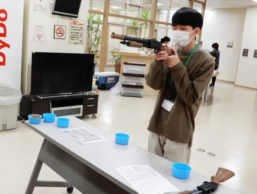 射的を担当し、試し打ちをしてみる上田くん(2年)