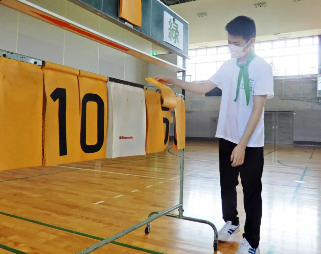 大江君(2年)。勝ったチームに10点、負けたチームに5点を入れます。