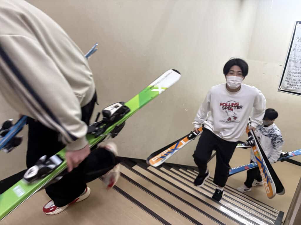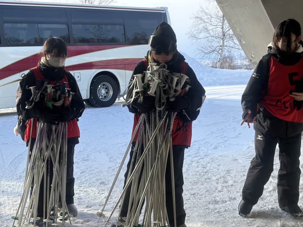 スキー実習を終えた後は、レンタル用具の返却作業。
