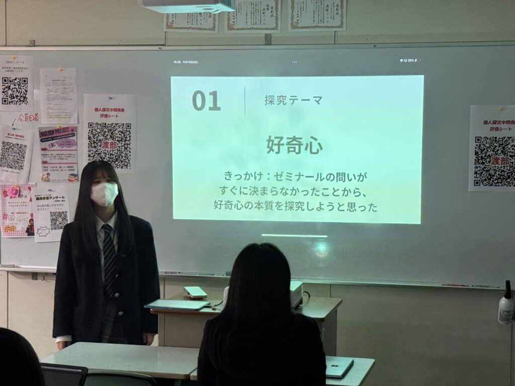 渡部クラスでは、その舞台への挑戦に向けて、個人探究の“現在地”を確認する中間発表会を行いました。