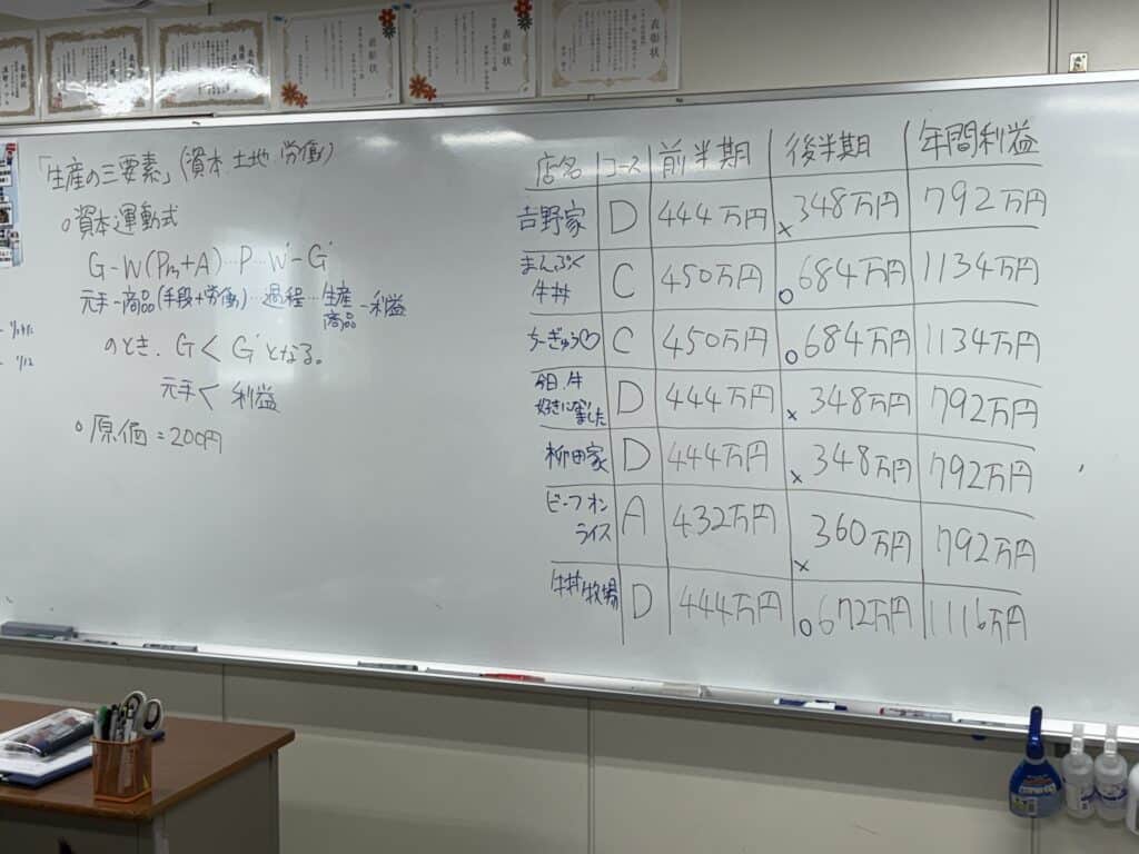 今回は3年生最後の授業ということで、経済をテーマに牛丼屋を経営するシミュレーションゲームを行いました。