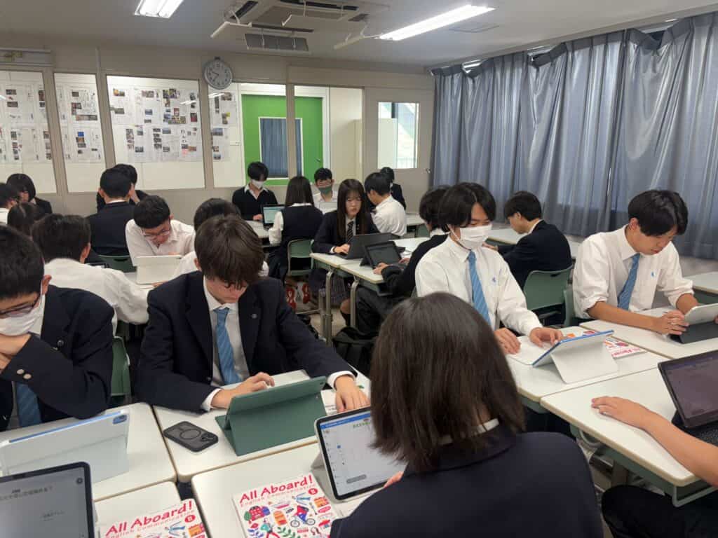 生徒たちは、貧困、教育、環境、ジェンダーなどの課題について資料を調べ、英語の情報にも触れながら理解を深めていきました。その上で、これらの課題に対して私たちに何ができるのかを考え、意見をまとめる活動に取り組みました。英語を「学ぶ」だけでなく、「考え、伝えるための手段」として活用する姿が多く見られました。
