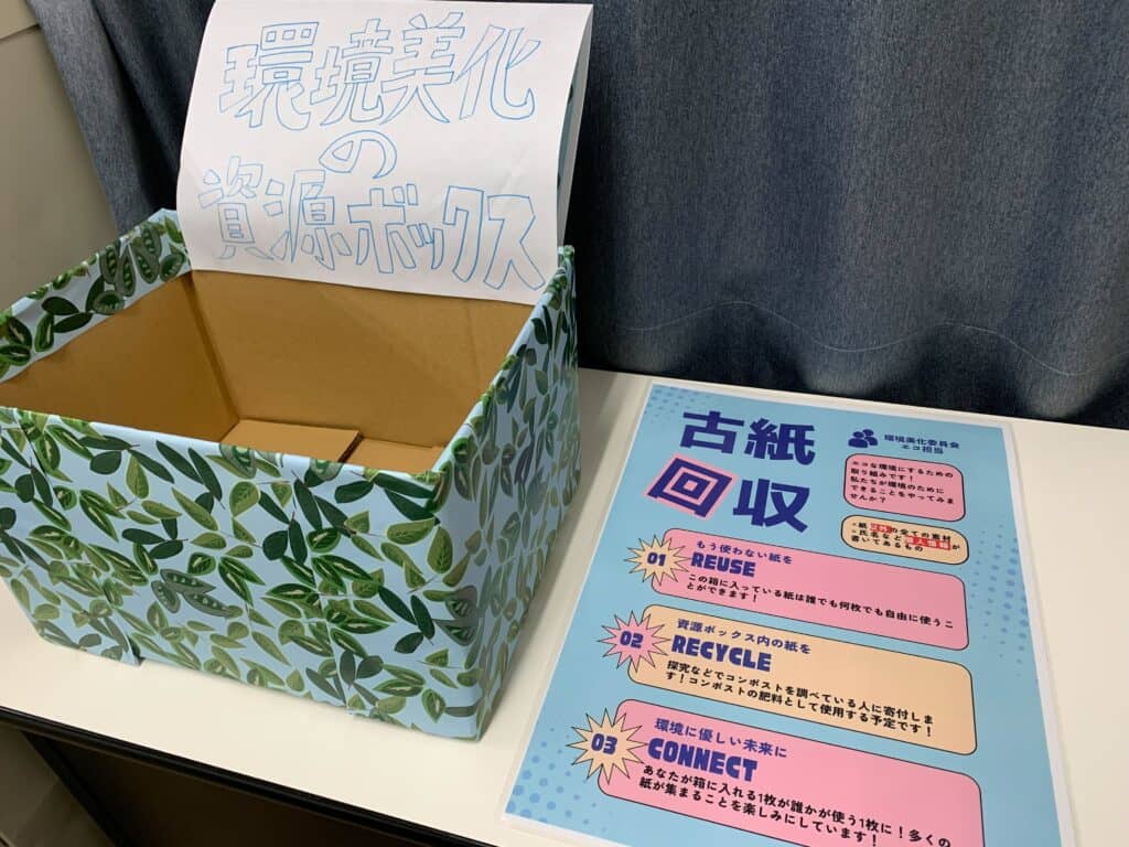 現在は、全クラスへの観葉植物の設置や資源ボックスの設置に向けて活動中です!