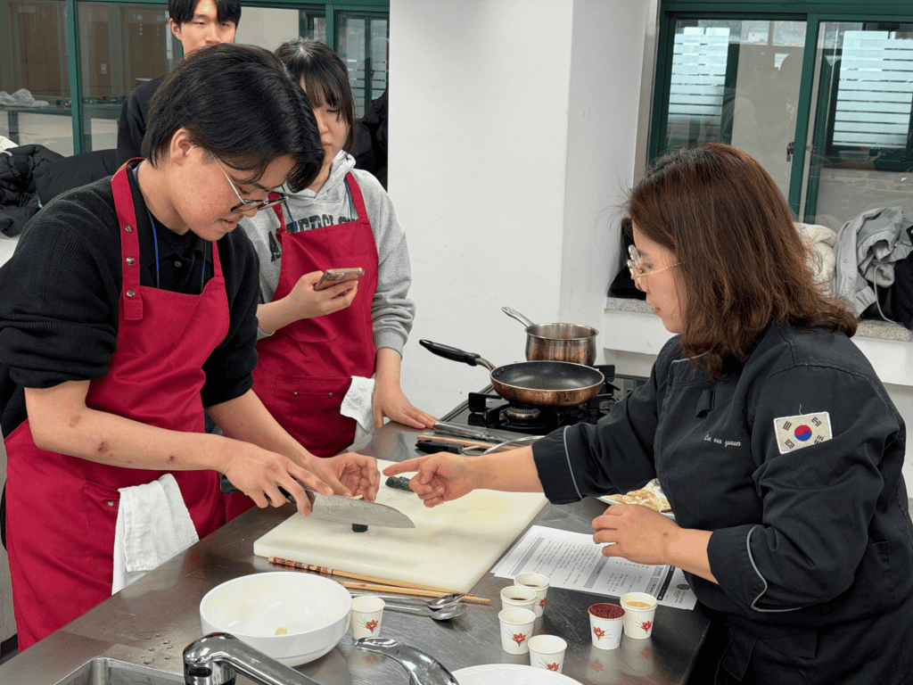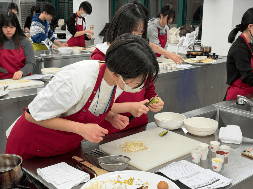 先生による丁寧なレッスンのもと、ナムルの味付けや食材の意味、彩りや盛り付けに込められた考え方など、料理を通して韓国の食文化について学びました。実際に手を動かしながら学ぶことで、生徒たちにとって理解がより深まる時間となっています。