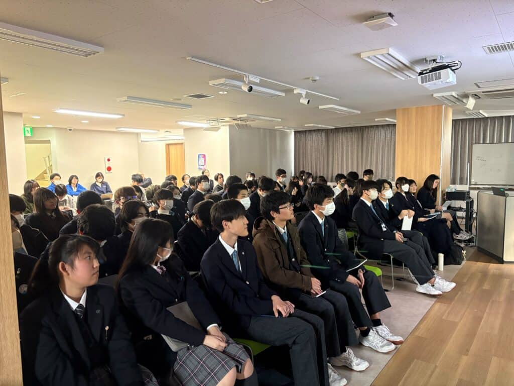 スクリーンに映し出されるのは、厳しい予選を勝ち抜いてきた全国の代表生徒たち。身近な疑問から出発し、社会課題の解決に向けて深く掘り下げた探究内容や、大人顔負けの堂々としたプレゼンテーションスキルに、生徒たちは真剣な眼差しで画面に見入っていました。