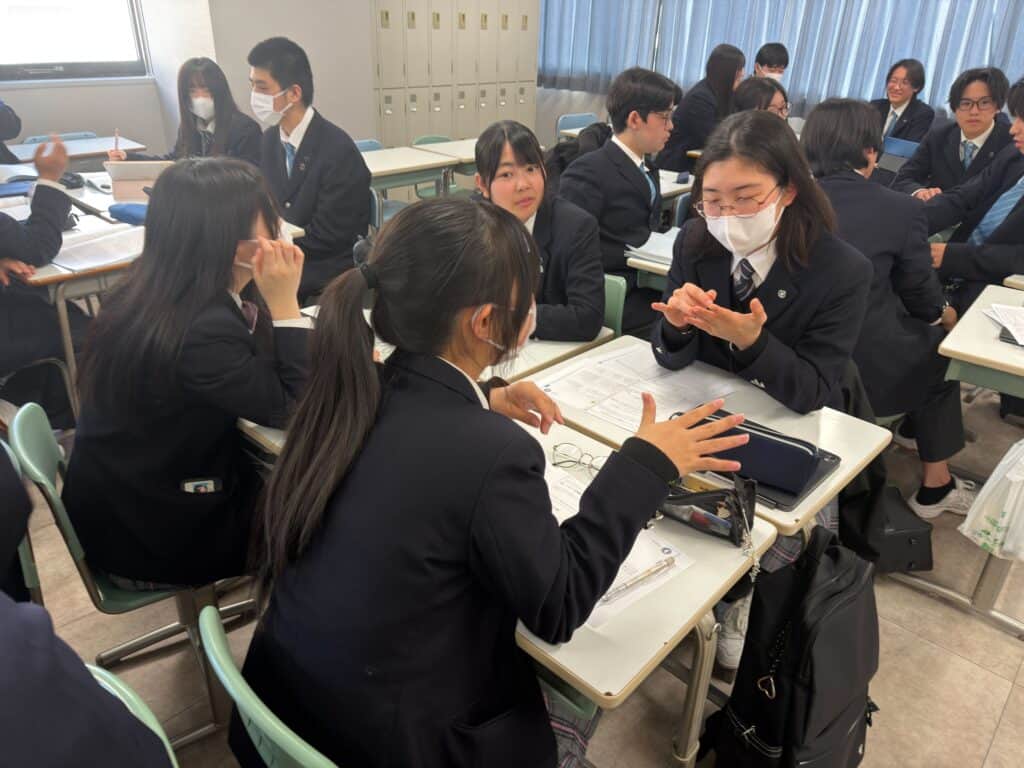 グループディベートでは、相手の意見を聞きながら反論を考える姿や、「なぜなら〜」と理由を明確にしようとする姿が見られました。普段は控えめな生徒も積極的に発言し、グループで協力して考えを深める様子が印象的でした。