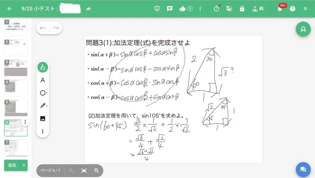この日は、「三角関数」という内容について学び、一つの公式から複数の公式を導く方法学習しました。「暗記」も大切ですが、導くことで「確実な理解」に繋がり学力を伸ばすことができます。