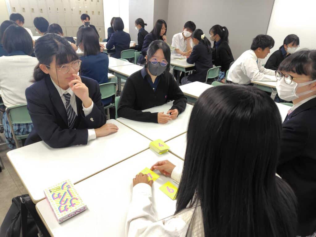 後半ではチーム対抗で「ito」というカードゲームと生徒の一人が作成したクイズを行いました。カードゲームでは、配られた数字を直接言わずにテーマに沿って数字の大きさを例えて数字の小さい順に並ぶという内容に、どのチームも大苦戦!クイズ大会では、一般常識からアニメについて、担任の先生のことなど、様々なジャンルがあり、皆さん大盛り上がりでした。