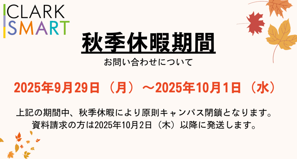 CLARK SMART横浜キャンパスでは、以下の日程が秋休みとなります。