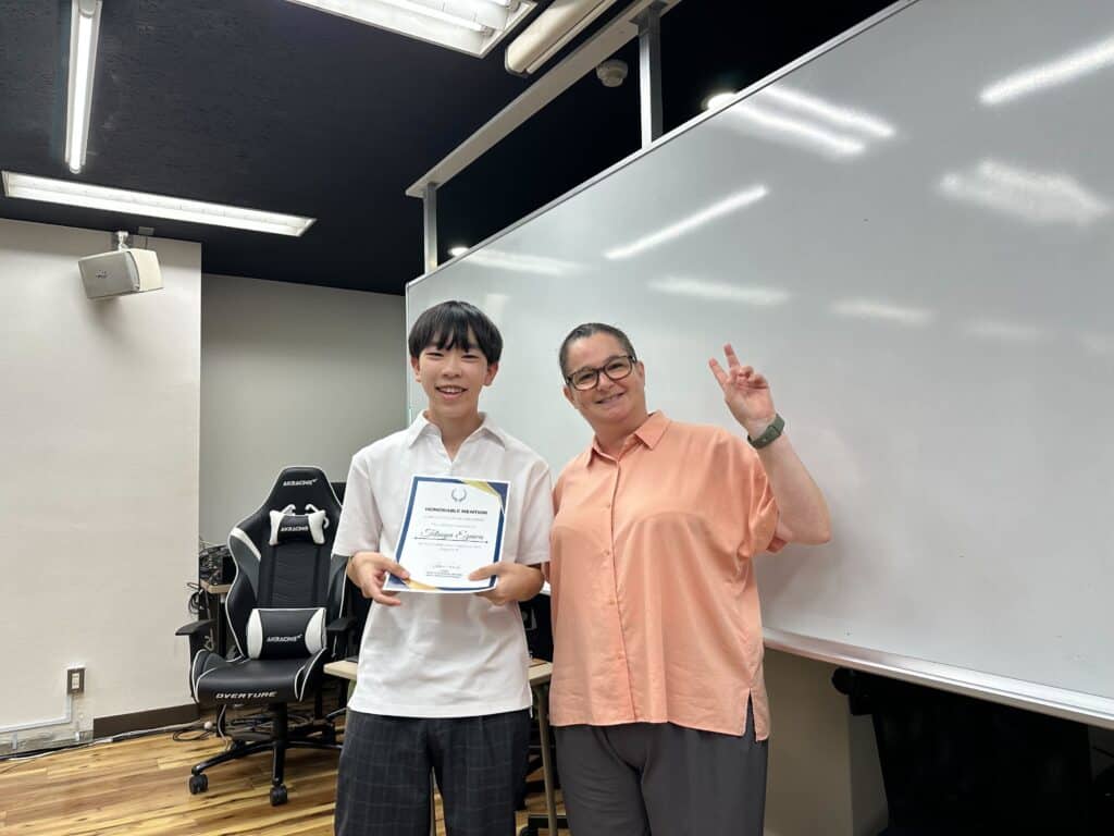 「正直、賞を貰えると思っていなかったのでとても驚きました。今回は自分の経験がテーマだったのですが、ネイティブの先生のリーディングライティングの授業で表現を学び、自分の知っている英語に当てはめて頑張って文をつくりました。まだ英検を受けたこともなく、英語がすごく得意というわけではありませんが、今回の受賞を機に自信がつきました。10月には英検3級に挑戦します。ライティングもあるので、しっかり準備をして臨みたいです。」