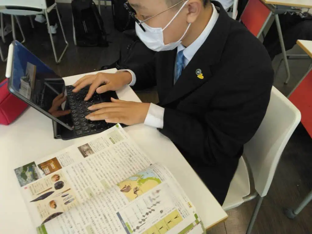 3年生初回の授業では、それぞれの習熟度クラスの中でで早速グループに分かれて、自分たちで指定の範囲からテーマを決めていきました。